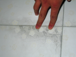 據(jù)何鐵柱敘述,裝修的時候,為避免地磚被硬物劃傷,他曾用廢紙箱蓋在地磚上,勾地磚縫時,便發(fā)現(xiàn)有些地磚花了,就像被磨漏后沾了臟東西。因為還沒有裝門、吊頂、櫥柜及燈具,所以他又用廢紙箱將地磚保護起來??傻鹊降蹴斞b完后,他發(fā)現(xiàn)花的地磚更多了,也花得更厲害了。
