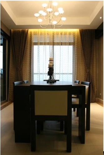 沙曼與窗簾的結(jié)合,給餐廳營造了一絲的浪漫,顏色的運用也呼應(yīng)了整個色調(diào)。燭臺的運用給端正硬朗的餐桌帶來一絲柔和之氣。