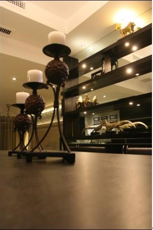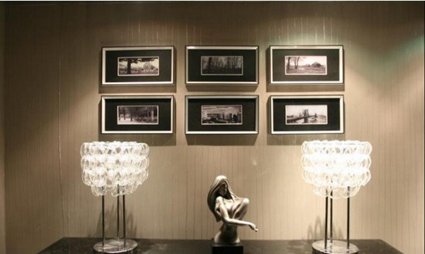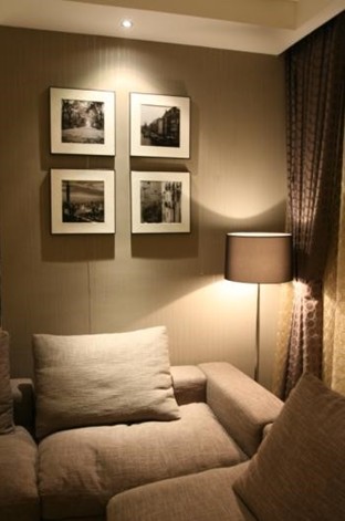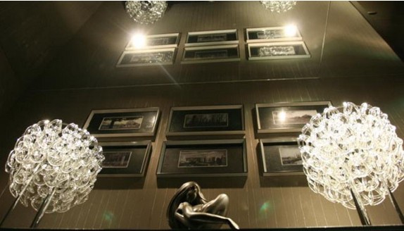 在燈光的映襯下,整個空間的顏色都變得渾然一體,這時,必須要有東西來喚醒我們的雙眼。照片墻的運用整個空間的一大特色之一,白色的框架,放上復(fù)古懷舊的風(fēng)景照,時尚又不失檔次。