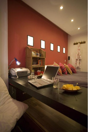 在臥室床的靠窗一邊設(shè)置了一長條書桌,可以擺入兩臺電腦,在臺上放個(gè)軟墊就能很舒服地上網(wǎng)。原先應(yīng)該是飄窗的位置做成書桌椅子的擺放處,擺上軟墊或躺或坐都是很好的選擇。第一次看到的時(shí)候真是不禁為這個(gè)設(shè)計(jì)叫絕,既節(jié)省空間,又能夠讓主人隨自己喜歡的姿勢來使用。這樣的貼心設(shè)計(jì)誰人不愛呢?