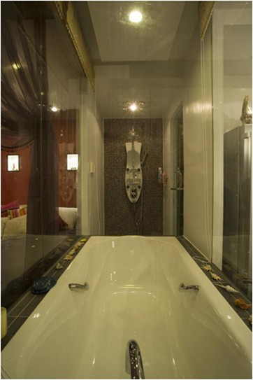 親密的二人世界里不用考慮遮擋,浴缸處半透明的羅馬簾可收可放,更多為了增添情趣,而非私密考慮。