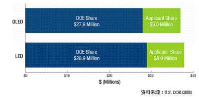 2008年,美國固態(tài)照明共有51個項目計劃,總經費為7470萬美元(圖一),其中OLED照明共有25個項目,總經費為3690萬美元,占所有項目的49.4%,其中美國能源部投入2790萬美元,而申請參與此計劃者則投入900萬美元;LED共有26個項目,總經費為3780萬美元,占所有項目的50.6%,其中美國能源部投入2890萬美元,而申請參與此計劃者則投入890萬美元。從OLED照明與LED的研究經費分布,我們可以發(fā)現(xiàn)OLED照明項目的比重(49.4%)已經等同于LED項目,雖然OLED照明尚未量產,但是OLED照明具有后起之秀的態(tài)勢,所以國雖投入LED照明技術研究的同時,也加重OLED照明的研發(fā),可見美國是越來越重視OLED照明。