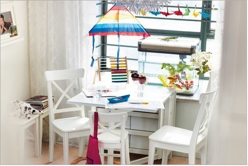 流線型設計的書桌椅,純凈自然。五顏六色的風箏、紙鶴在綠色窗體的襯托下變得絢爛起來,為空間營造出小巧又亮麗的景致,整個空間都充滿北歐風格的簡潔和自然美感。