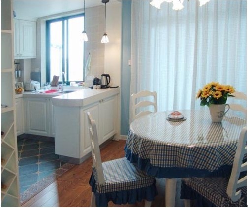 廚房開放式設計,通透的空間依舊是藍白色搭配,家具用的簡潔恰當。小小的圓桌,格子的桌布,清新怡人。向日葵則給餐廳空間增添一抹亮色,溫馨的氣息撲面而來。