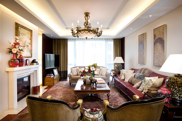 這個(gè)是客廳的全景,全家人共用的客廳。沒有改變房型的情況下,這個(gè)客廳是長方形的,空間夠大,歐式壁爐是為裝飾品亦是一種文化的承認(rèn)。中式文化的影子遍及整個(gè)客廳,小到燈具花瓶擺設(shè)。