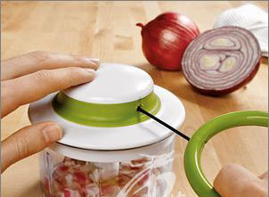 它的原理與普通的攪拌機類似,不同之處在于采用了全手動的設計,只要將洋蔥放進去,然后用力拉扯上面的繩子,就可以迅速將洋蔥切碎了。