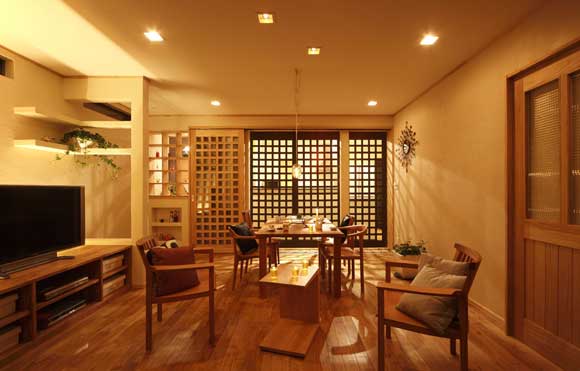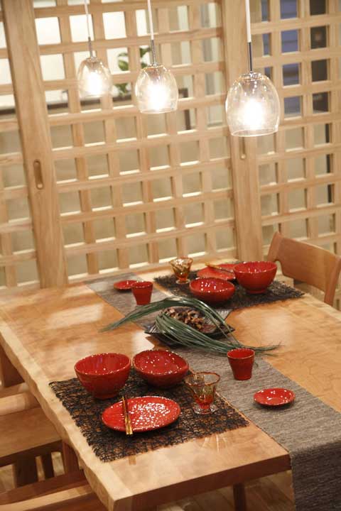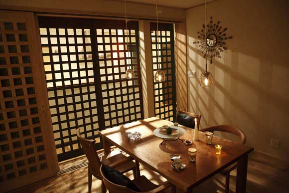 飯廳里的桌椅都是木頭做的,上圖為自色光線情況下,有著另外一翻情調(diào)。燈光穿過格子屏風(fēng)投影在墻上,繪出交錯的線條,光與影的藝術(shù)讓這個飯廳顯得與別不同。格子屏風(fēng)是裝飾上的一大美點所在。