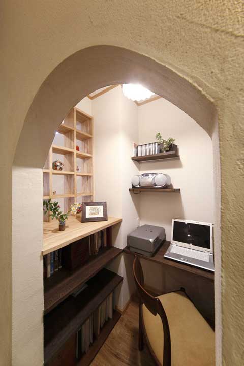 對應(yīng)著廚房的另一個角落,原先可以說一個家居死角,改良后成為一個小小的工作間,加以拱形的門設(shè)計,又多了一些些活潑可愛的格調(diào)。