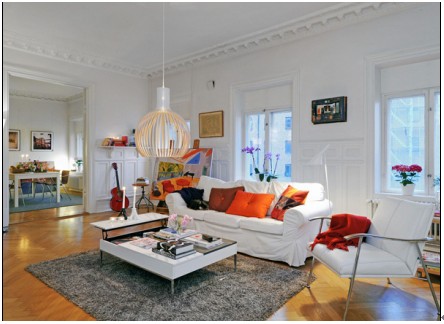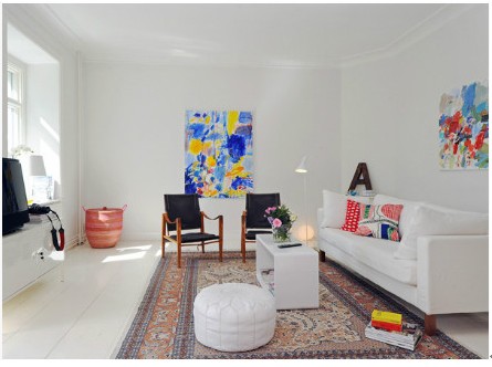 白色的空間內可以很大限度的施展你的想象力,民族氣息的地毯,抽象的裝飾畫,墻角的A字母,四方的茶幾等。每一樣物件都很好的充填了白色的空間,讓單調的空間富有生氣。窗外陽光的照射使房間更加明亮。