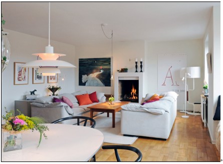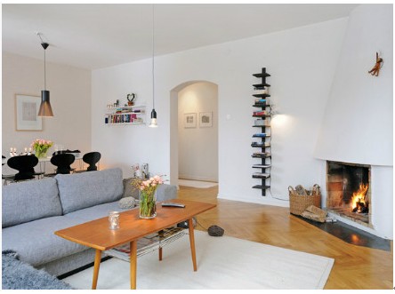 白色的墻面上黑色的簡約層架,即是裝飾品又是儲物空間。熊熊燃燒的篝火也許不太適合中國的家庭,但仿壁爐式的取暖爐配合一下煙囪的造型,在寒冷的天帶來暖風的同時,不同用出國就能感受北歐般的生活。