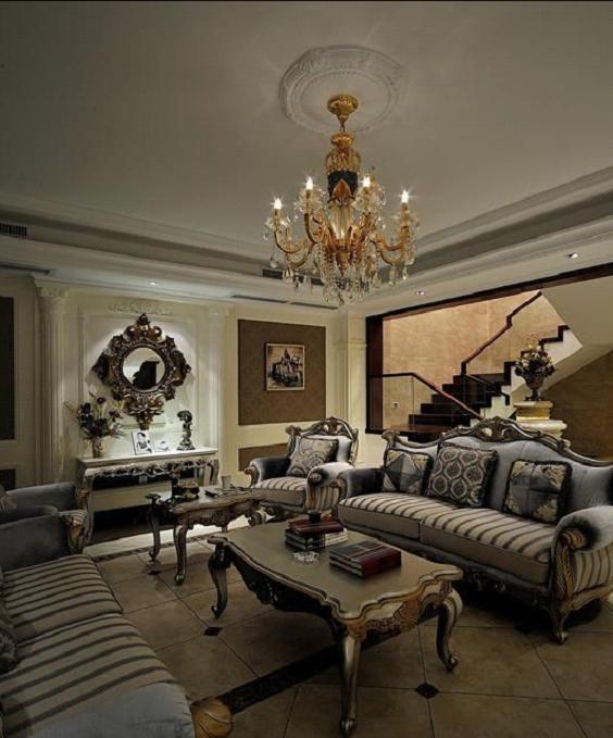 會客廳還原了他原本的功能,并沒有放電視機(jī),而是用裝飾壁爐代替了傳統(tǒng)的壁爐,在美觀上和實(shí)用性上都考慮的很到位。整套沙發(fā)的顏色用偏冷的色調(diào)來烘托整個(gè)空間的暖色調(diào),是的空間極具顯張力。這個(gè)方案在細(xì)節(jié)之處抓到了極致,不管是壁爐的造型、裝飾柱還是頂部吊燈的裝飾,精湛的技術(shù)活不得不讓人折服。