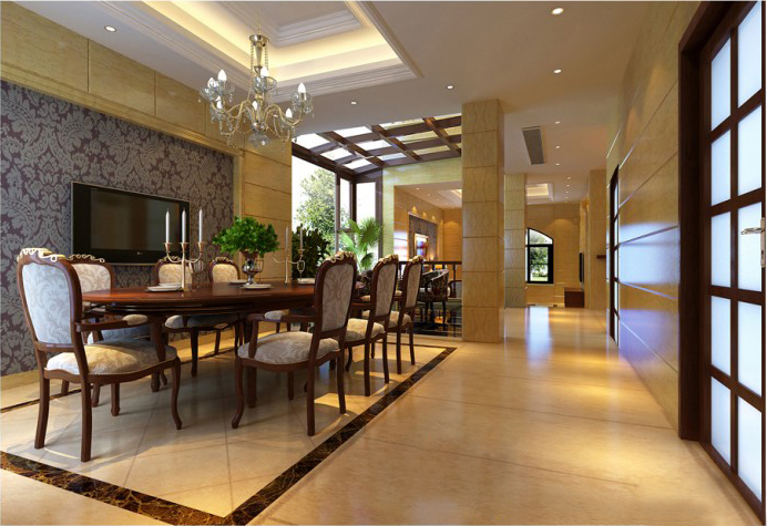 雅致的背景造型、考究的配飾、精湛的工藝,均是現(xiàn)代與古典相融的結(jié)晶,讓主人的審美情趣在優(yōu)美的線條、和諧的色調(diào)中自然流露。從玄關(guān)到客廳再到餐廳,空間流暢通明,名貴內(nèi)斂的淺調(diào)天然石料是地面和墻身的主材,石材與原木飾面墻壁形成鮮明而自然的對比。純凈的米色奠定了居室的基調(diào),放棄傳統(tǒng)歐式風(fēng)格中繁復(fù)的曲線與雕花后,明快的直線條勾勒出空間的清爽氣質(zhì)?!】蛷d的沙發(fā)背景運(yùn)用了西班牙米黃仿古石飾面中間用石材線條內(nèi)貼墻紙,墻紙中間掛上一幅藝術(shù)油畫,視覺效果既豐富又有立體感。一套大氣的組合歐式沙發(fā)配上實(shí)木的茶幾顯得主人家的品位。并彌漫出一份現(xiàn)代而古典的韻味。