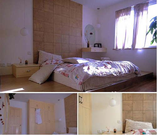 臥室仍然是原木色為主調(diào),門/背景墻/矮柜/化妝臺均已原木選材,簡約而環(huán)保。大大的窗戶,飄逸的窗簾,充足的自然光,盈滿臥室,整個室內(nèi)空間顯得大而通透,綠植盆栽,則增添一絲清新。