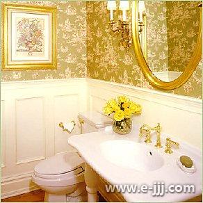木質(zhì)的墻面板和金色美麗花紋的墻紙向大家展示了一個(gè)迷人的新殖民地風(fēng)格主衛(wèi)生間。