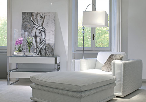 右側(cè)單人沙發(fā)Soft Couture和配套的方形坐墩,白色真皮手縫圖案。沙發(fā)參考價(jià)格10000元,坐墩參考價(jià)格50000元??繅γ鏀[放的是咖啡桌Oscar,金屬結(jié)構(gòu)配有白色上漆抽屜。參考價(jià)格77000元。窗前落地?zé)鬜ound參考價(jià)格37000元。