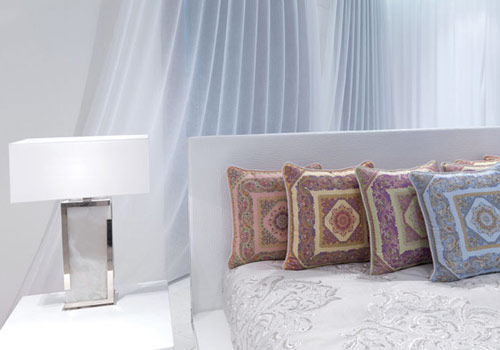 臺(tái)燈Marble使用明亮的鍍鉻材質(zhì)。提花靠墊的鮮艷色彩同整體的純白環(huán)境形成鮮明對比。靠墊參考價(jià)格1500元起。