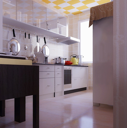 此戶型為兩室一廳的房間,面積不大,基本上是沒有餐廳的位置,為了讓空間看起來擴(kuò)大些,設(shè)計(jì)師把原始的廚房墻打掉,做成一個(gè)開放式的現(xiàn)代廚房,并在餐廳及廚房中用用一些實(shí)木線條做隔墻。并噴上白色的油漆。廚房的櫥柜面板采用的是白色烤漆板,配上黑色的大理石臺(tái)面顯得整齊又大方,廚房功能是儲(chǔ)存生活的必備,平時(shí)做飯也就是儲(chǔ)存,洗滌和烹調(diào)。由于廚房的空間不大,但功能卻很多,廚柜的每一個(gè)抽屜內(nèi)部的功能都是不一樣的,各種內(nèi)置式的抽屜和金屬拉藍(lán)。給主人提供了方便的操作空間。廚房的頂采用黃白相交的方形鋁扣板。地面鋪600*600的防古地磚一直延伸到客廳。餐廳的餐桌選用的是胡桃木配上軟軟的黃色布藝墊。餐廳的燈光既不能太強(qiáng)又不能太弱,燈光要以溫馨的黃色為基調(diào),再配上藝術(shù)吊燈?餐廳旁邊的白色墻上也可以掛上一幅藝術(shù)油畫。增加房間的藝術(shù)氣息。