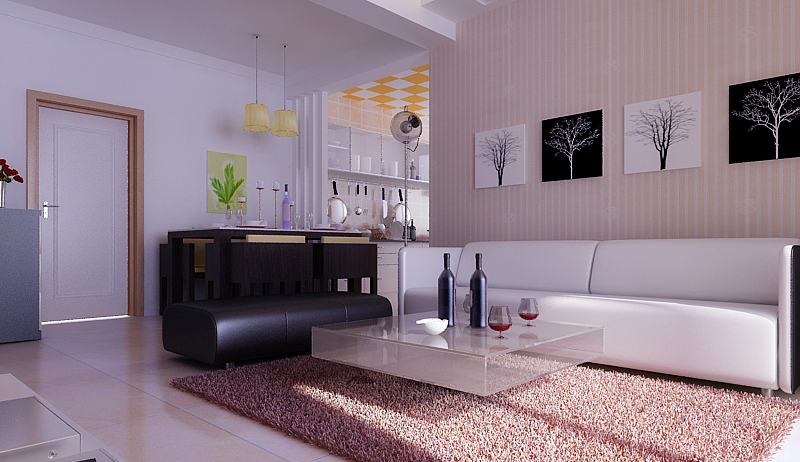 客廳對(duì)于家庭成員來說,除了是多功能的,多用途的空間,還是生活空間的中心,它用了餐廳在廚房及客廳的一個(gè)過渡來建立一個(gè)獨(dú)立分區(qū),使一家盡情的看電視及聽音樂??蛷d設(shè)計(jì)采用了簡(jiǎn)約現(xiàn)代的風(fēng)格,這與個(gè)人文化背景和家庭修養(yǎng)的基礎(chǔ)上,設(shè)計(jì)有自己特色的居室風(fēng)格。房屋的結(jié)構(gòu)上,要以最大限度地獲得了自然采光。電視背景墻采用了直線的石膏板做簡(jiǎn)易的直線造型,內(nèi)貼暖色的豎紋墻紙,并配上一條從頂?shù)降氐牟枭AВ箍蛷d有了明顯的延伸空間。黑白配的沙發(fā)圍繞著玻璃茶幾,沙發(fā)獨(dú)立成組靠在一角。地毯用的是毛絨絨的毛線地毯。給人一種舒適安靜的感覺。沙發(fā)背景沒有做多的裝飾,只是整面墻貼豎紋的墻紙,面墻上的藝術(shù)畫也是黑白配,客廳的整體效果相協(xié)調(diào)。相呼應(yīng)。