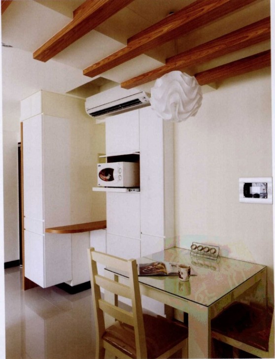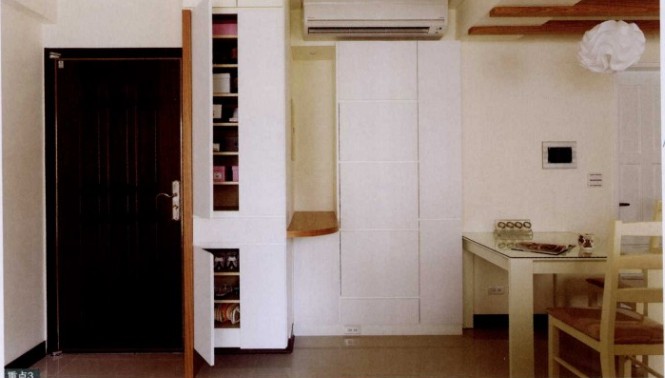 感嘆于小戶型的收納門道,每一個地方都不能放過,入門柜體即為隔斷的玄關柜,同時也是鞋柜,有效地利用了空間,而延伸出來的隱藏式收納柜體,則為電器柜及收納雜物的餐柜。