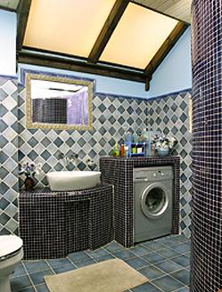 基調(diào)是一片蔚藍(lán),藍(lán)色的馬賽克、灰藍(lán)色的地磚。因?yàn)榭臻g相對(duì)較大,所以主人就有了很大的發(fā)揮余地,為洗衣機(jī)量身定做的小臺(tái),上面還可以放一些雜物,弧形的洗手池、手盆與同樣造型的整體浴房呼應(yīng)著,“整體浴房”其實(shí)是主人自己用磚砌出來(lái)然后貼上藍(lán)色馬賽克做成的。大面積使用馬賽克,并在頂部鋪上了溫暖的桑拿板,刻意做成的斜屋頂式燈箱是主要光源,設(shè)計(jì)的本意是希望給這個(gè)沒(méi)有一扇窗子的衛(wèi)生間,帶來(lái)一種有天窗的錯(cuò)覺。