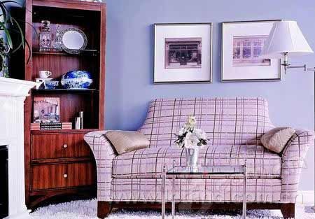 灰藍墻面打底的基調(diào)上,歐式白色裝飾壁爐是古典家居的標準配置。多層扶手的土色格紋沙發(fā)突出都市人青睞的舒適和簡潔,金屬框架雙層玻璃的可移動式小幾方便碼放雜志和零食,在視覺上也通透無比。角柜的設(shè)計半中半西,擺放的西洋酒具和青瓷盛器也糅合了兩種風格。