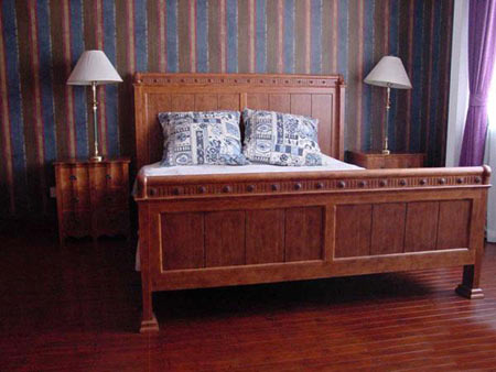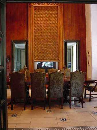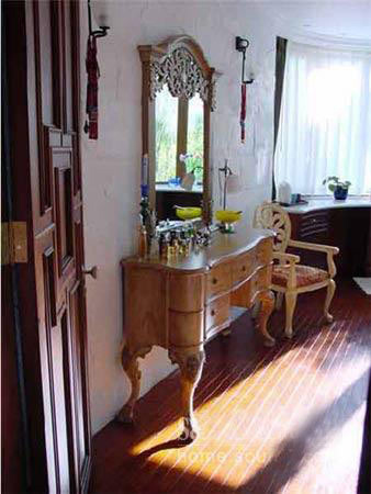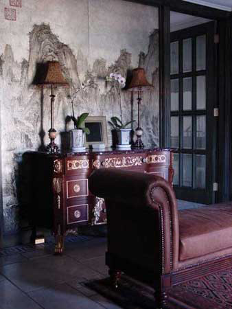 我家里的很多木制的門、書柜、櫥柜都是有呼吸、有生命的。即便有些地方刷上了大綠,別人可能會(huì)想綠色很怯,但經(jīng)我處理以后,這個(gè)綠是透明的。每一處木頭的顏色都反復(fù)做了很多遍,手撫摩的時(shí)候非常有質(zhì)感。有些人看了以后說:´噯,你這不錯(cuò),我也學(xué)學(xué)。´我告訴他們?cè)趺磁模蓟厝プ隽?,結(jié)果沒一個(gè)人做出來(lái)是這意思。知道為什么嗎?──偷懶!中國(guó)人怕麻煩,各行各業(yè)都想省事。我這個(gè)漆反復(fù)打磨了7、8次,干了,砂輪磨掉,再用很淡的水彩顏色刷,漆了一個(gè)月??伤麄?天就干完了,一共才刷了2、3回。工序到不了,不來(lái)這效果。要想讓木頭不是´死´的,就要用很豐富的顏色沁在木頭里面,反復(fù)摩擦反復(fù)吃進(jìn)去,就像畫油畫一樣,反復(fù)畫很多層和你只畫一遍出來(lái)的質(zhì)感是不一樣的。
