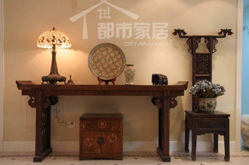 這是初進(jìn)門時(shí)展現(xiàn)在我們眼前的情景。明亮的日光透過(guò)紗簾來(lái),整個(gè)房間沒(méi)有太多隔斷,感覺(jué)上開(kāi)闊通透極了。左側(cè)的一組中式家居配飾搭配很醒目,紅木條幾、小木柜、瓷盤瓷瓶、老式臺(tái)燈以及一把靠背超高的凳子,這租搭配其實(shí)是隨心所欲而為之的,卻顯然成為了別墅入口處最隆重的一角。