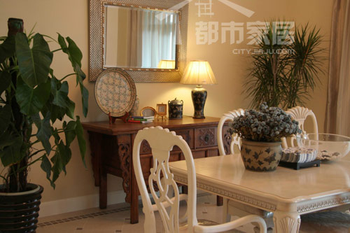 餐廳是中西合璧的典型,兩大件風(fēng)格迥異的家具在這里聚合,白色的歐式餐桌椅和棕色的中式木邊幾,你不讓我,我不讓你,各有各的獨(dú)特魅力。同樣的柔美曲線,同樣的精細(xì)雕花,展現(xiàn)的卻是完全不同的文化底蘊(yùn)和審美情趣,讓用餐的人不會(huì)感到絲毫的單調(diào)和冷清。