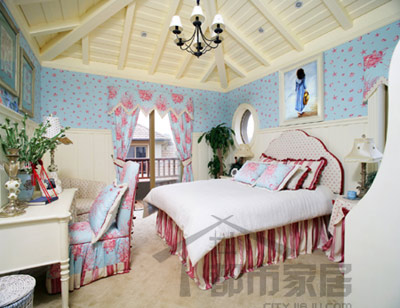 天花板的造型很漂亮,設(shè)計(jì)師模仿的是海邊小木屋里木結(jié)構(gòu)外顯的天花板,頗有度假屋的自然風(fēng)情。天花板被涂刷成奶油色,和藍(lán)色、粉色搭配在一起凸顯的是純真可愛(ài)的少女氣質(zhì)。
