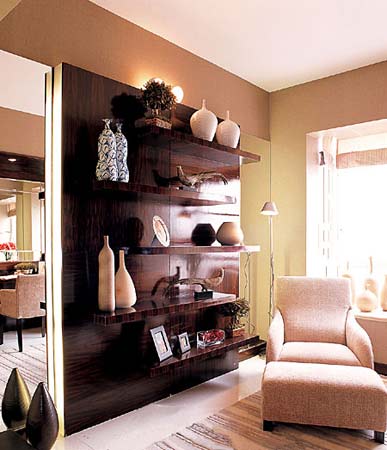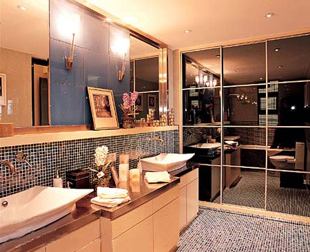 客廳、臥室和書(shū)房到處陳列著年輕新貴所喜愛(ài)的藝術(shù)擺設(shè),洗手間也以紫啡色調(diào)的玻璃馬賽克為鋪地和墻身貼面,并配以茶色鏡面,加上石臺(tái)的折射,讓里外的空間都統(tǒng)一在另類、浪漫的格調(diào)之中。淡淡的悠然從客廳流淌到飯廳,匯入純潔的白,激蕩起一輪輕快的圓舞曲,一路高調(diào),意欲歇而情不止……