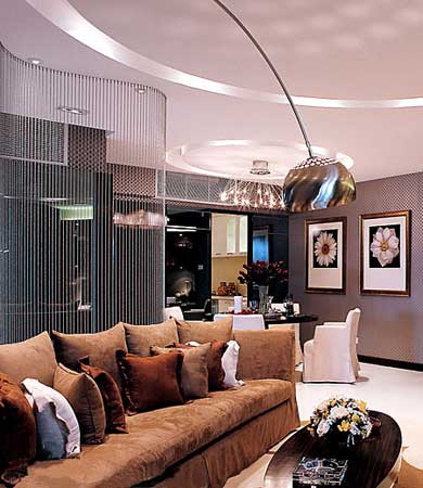餐廳與客廳用圓形的天花燈槽增強(qiáng)了空間的獨(dú)立感,弧形的座燈與圓點(diǎn)圖案的地毯令整個(gè)空間氣氛沉靜卻不失活潑。臨空而懸的水晶珠簾是客廳的生輝妙筆,把飯廳與客廳區(qū)分開(kāi)來(lái),然而有隱約可見(jiàn)對(duì)方,給居室布置了一種隔而不斷的布局。