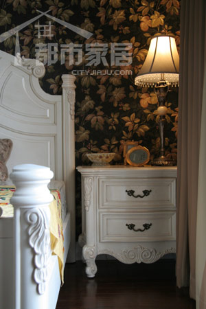 顏色的重要性同樣體現(xiàn)在主人的臥室里。黑色的花朵壁紙,沒錯(cuò),設(shè)計(jì)師用的就是大膽而絕配的黑色壁紙,一下子就烘托起神秘、幽靜的氛圍來。然而因?yàn)橛辛硕涠涮S的白色花團(tuán)的點(diǎn)綴,墻面一點(diǎn)兒也不顯得壓抑。臥室里的家居配飾一律為歐式風(fēng)格。