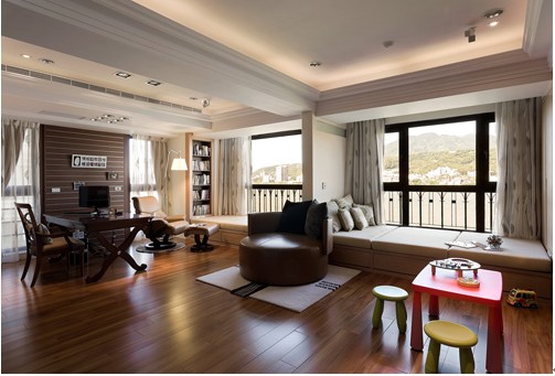 拋去傳統(tǒng)書桌設(shè)計,利用面窗臥榻柱體做出開放式書柜,將閱讀帶出了另一種選擇。而在公領(lǐng)域上,書桌的擺設(shè)點出閱讀的場域,并藉由壁面上木板溝縫變化出可自由更換勾掛照片天地。