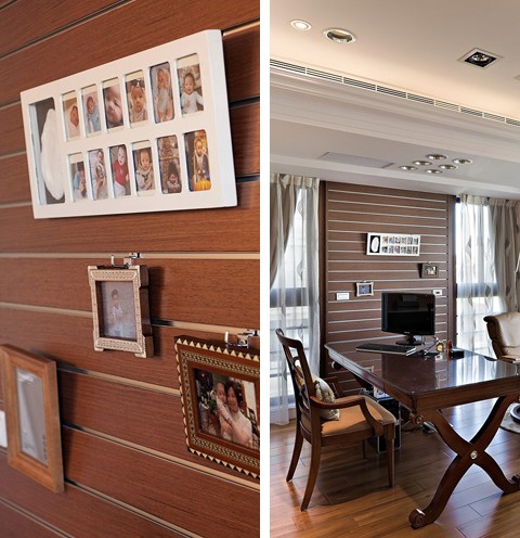 在公領(lǐng)域上,書桌的擺設(shè)點出閱讀的場域,并藉由壁面上木板溝縫,變化出可自由更換勾掛照片天地。