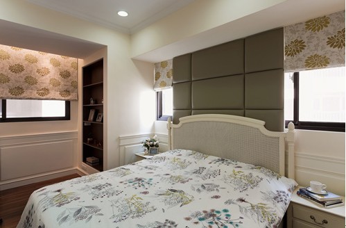床頭運用了印花卷簾的設(shè)計,兼顧美感的同時也穩(wěn)定了睡眠的質(zhì)量,衣柜部份頂天的柜體,各類物品輕易分門別類。透過線板的造型,在壁面上設(shè)計出簡約的華麗美感,讓臥室有了低調(diào)的質(zhì)感。