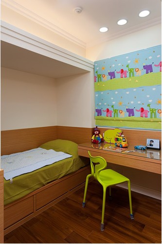 原木色加以綠色點綴,輕古典里透露出繽紛的局面,色彩艷麗的卷簾突出空間的主題性,床邊木色壁面貼皮帶出了溫暖的質(zhì)地。在度假中享受這空白般的愜意,也是設(shè)計師給小朋友的生活體驗。
