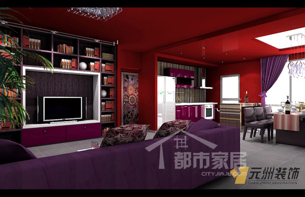 深重的紅色和紫色搭配在一起神秘莫測,嫵媚卻不輕浮,然而客廳的采光條件并不是很理想,用這么重的顏色使屋里看起來更加黑影憧憧,小編于是問設(shè)計師住在里面會不會感覺慎得慌。設(shè)計師說:“業(yè)主就是這么要求的,別忘了她是電影人。我去過她的工作室,比這里還要陰暗得多,可能他們習(xí)慣了這樣的環(huán)境吧?!编?,小編感覺走進這里真像是走進了電影院。