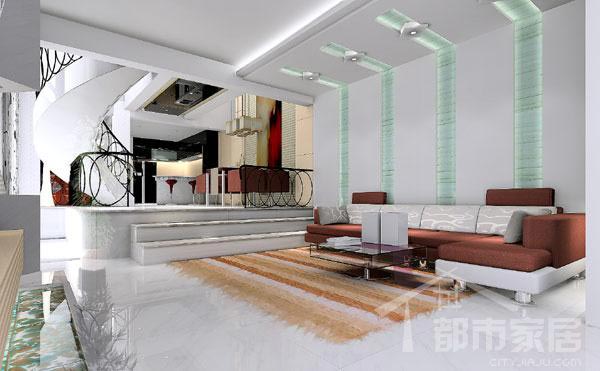 沙發(fā)背景墻和吊頂是豐富畫面內(nèi)容要素之一:粗糙的石膏板墻面與光滑的玻璃是一大對比。小面積玻璃板上細膩的紋路與大面積墻面的對比更是凸顯了這一點,沙發(fā)背景墻以及吊頂?shù)忍幍脑O計會讓整個房間在夜晚顯得更加精致。
