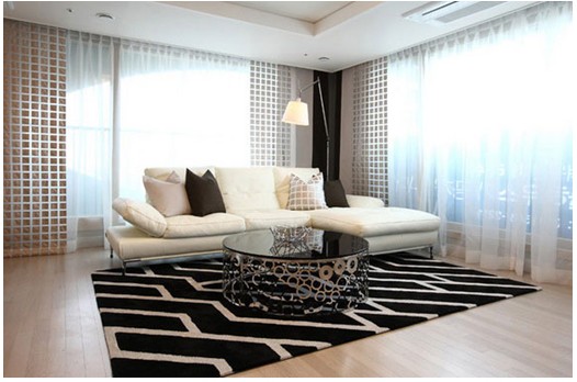 時尚現(xiàn)代的空間內(nèi)擺放白色沙發(fā)、黑色地毯,白與黑的經(jīng)典搭配,在杏色窗簾的柔和過度中散發(fā)著家的溫馨。淡黃色的吊頂讓人更容易放松心情,卸去一天的疲憊。深咖啡色的應(yīng)用,讓白、黑、杏色之間有一個更好的和諧過度。