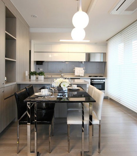 L型的飯桌腳設(shè)計,讓飯桌更加堅實牢固。大面積的落地玻璃窗,讓飯廳的采光更好,讓空間看起來更加寬敞開闊。假如家的坐向不理想,加入白色的百葉窗,阻擋部分陽光的同時部分陽光還是能滲透室內(nèi)。圓形的吊頂讓光線的涉及范圍更加大。