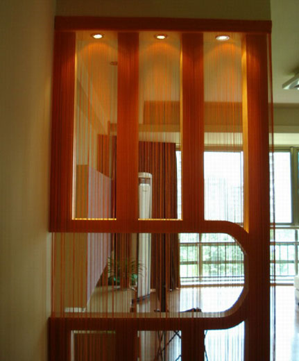 線簾因裝飾效果強(qiáng)烈,近來常被用于居家空間。線簾除了當(dāng)窗簾、門簾,也可作為輕隔間素材。像是客餐廳之間、臥房與書房間,若想劃分空間但又不失穿透性,那幺就可考慮使用線簾。