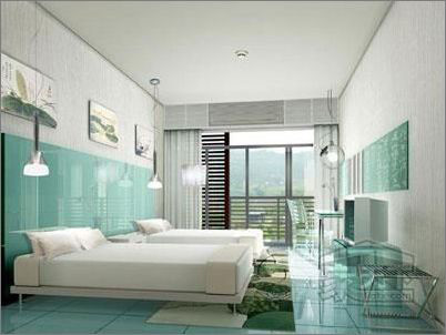 原型:凝重的白色墻壁,家具是簡單的深褐色白色,灰白相間的亞麻床品,即使有幾幅掛畫做點綴,但仍難以擺脫平凡冷清的感覺。