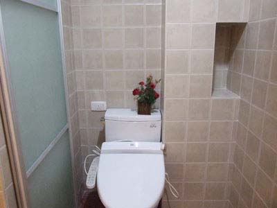 衛(wèi)浴間內(nèi)部,顯得非常簡潔,主要是空間不大,放不下更多的東西。不過,主人還是沒有忘記在馬桶上面放上一盆綠色植物,時刻不忘與大自然親密接觸。