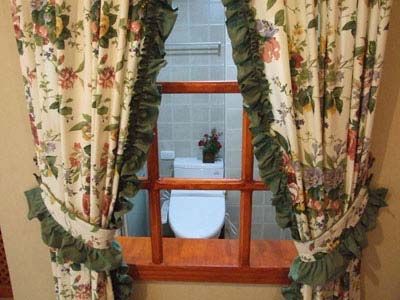 看清楚了,原來這里面是一個衛(wèi)生間,據(jù)主人講,原來這里是一面墻,光線和結構都非常不好,于是充分發(fā)揮他的聰明才智,又是請教師傅,又是上網(wǎng)查資料,方案做了一個又一個,最后決定把墻做成了窗欞的樣子,這樣既好看又光線通透,這實在是太有創(chuàng)意了,廣大正奮戰(zhàn)的裝修一線的網(wǎng)友不妨偷學這一招,絕對有意想不到的效果。