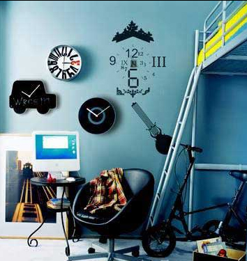 裝飾講究個性和偏好,把各種各樣的鐘表釘在墻上,灰色的墻面看起來不再呆板,有些童趣的造型,線條簡單,詼諧有趣,讓人心情愉悅,墻面也變得鮮活起來。