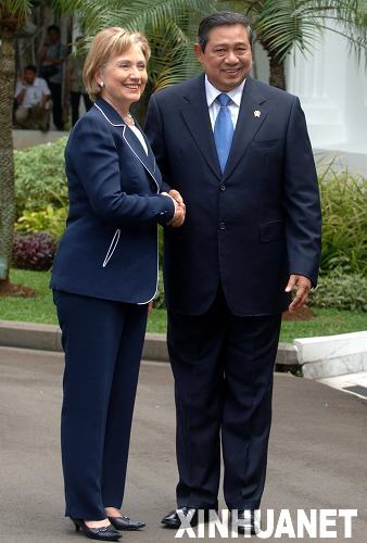 2月19日,在印度尼西亞首都雅加達(dá)總統(tǒng)府,印尼總統(tǒng)蘇西洛(右)會見到訪的美國國務(wù)卿希拉里。