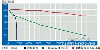 現(xiàn)在有的商家,為了降低成本,就采用幾百只φ5的小功率LED。然而這種小功率的LED的光衰是非常嚴(yán)重的,按照其光衰至80%的壽命只有1000小時(shí)。所以,作為需要長(zhǎng)期使用的路燈是絕對(duì)不能允許采用這種小功率LED的。作為大功率LED,其光衰就要好很多。然而國(guó)內(nèi)不少?gòu)S家也還是只能做到10000小時(shí)下降10%。遠(yuǎn)遠(yuǎn)不能滿(mǎn)足使用要求。
