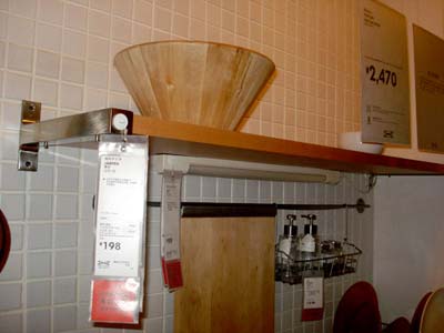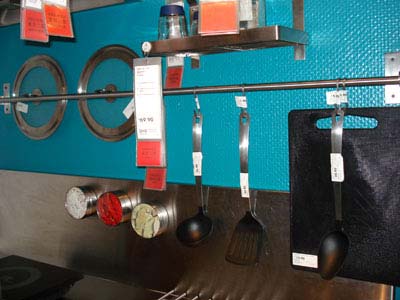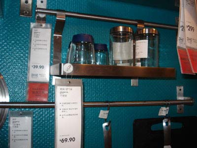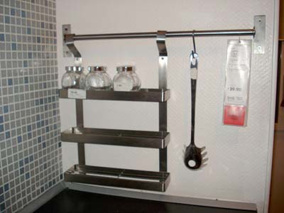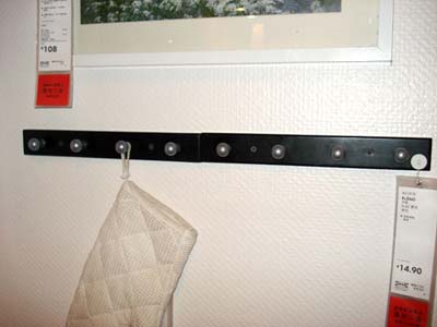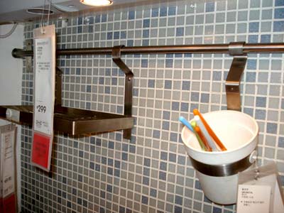 另一面墻上的掛桿,微波爐手套、圍裙等廚房用品就可以掛在這里,方便又整潔。這個掛鉤的價錢也不貴,僅花14.9元就可以在宜家里買到。