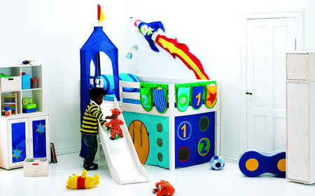 兒童專(zhuān)家表示,最好能給孩子一個(gè)游戲空間,因此最好選擇有趣味的家具,比如有滑梯、帳篷的,而且兒童房家具的擺設(shè)最好緊湊些,以便能騰出更大的游戲空間。