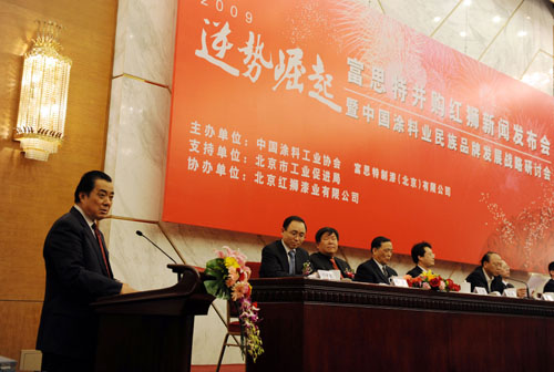 2月22日,里,“逆勢崛起·富思特并購紅獅新聞發(fā)布會暨中國涂料業(yè)民族品牌發(fā)展戰(zhàn)略研討會”在北京人民大會堂新聞發(fā)布廳舉行,逆勢崛起的民營企業(yè)富思特制漆(北京)有限公司成功和重新煥發(fā)生機的北京老名牌企業(yè)北京紅獅漆業(yè)有限公司這起被稱為“蛇吞象”的中國涂料領(lǐng)域民族品牌間的最大購并案成為人們關(guān)注的焦點。圖為北京市**茍仲文副市長蒞臨當(dāng)天的新聞發(fā)布會現(xiàn)場并講話。(攝影 馬寧 李曉梅)